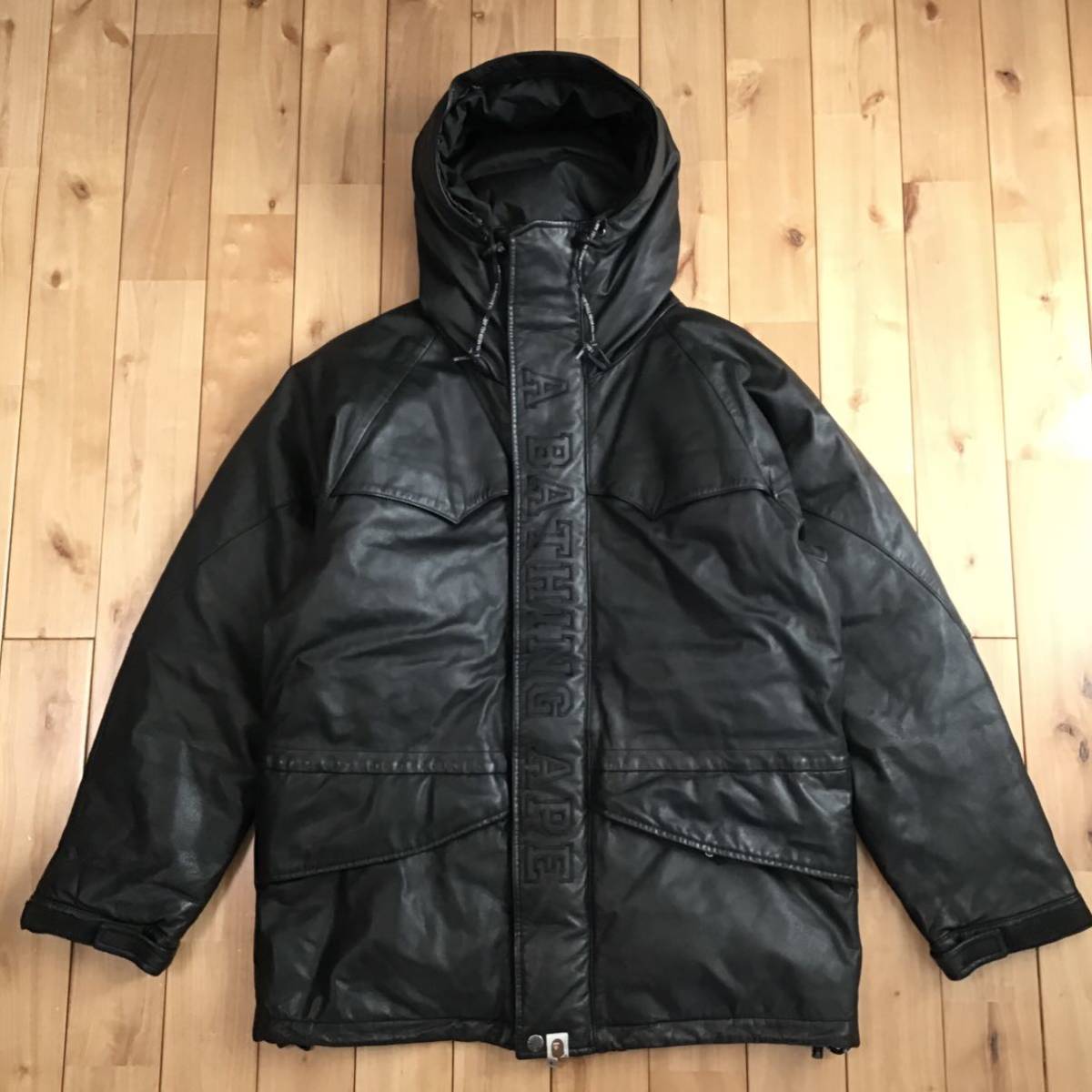 > BAPE 牛革 スノボ ダウンジャケット Sサイズ black a bathing ape BAPE cowhide leather hoodie down jacket エイプ ベイプ レザー w33
