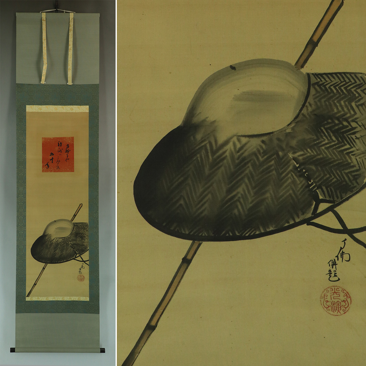 - 【真作】大谷句佛【笠画賛】◆絹本◆合箱◆掛軸 u10021
