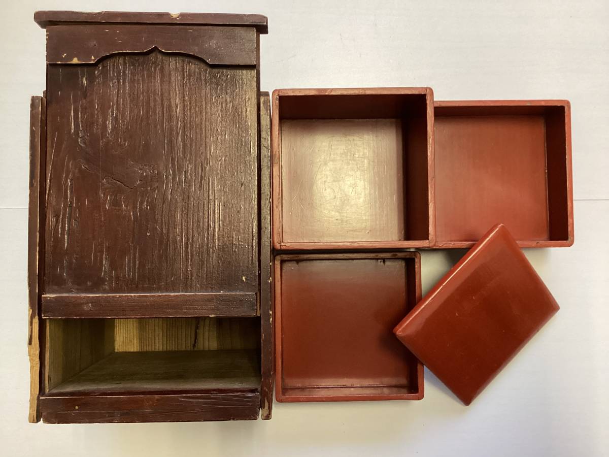 - 三段重箱 木箱 木製 漆塗調 和食器 ミニ アンティーク A2