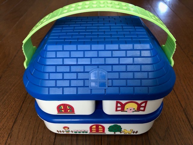- ランチボックス ハウス、2階建て、家型 バスケット 高14.2㎝ 弁当箱 犬 チューリップ ブルー&白 ピクニック 送料無料 底値