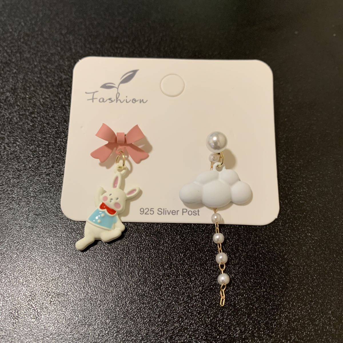 - メルヘン 雲と揺れるパールチェーン リボンとうさぎさん ピアス ゴールド
