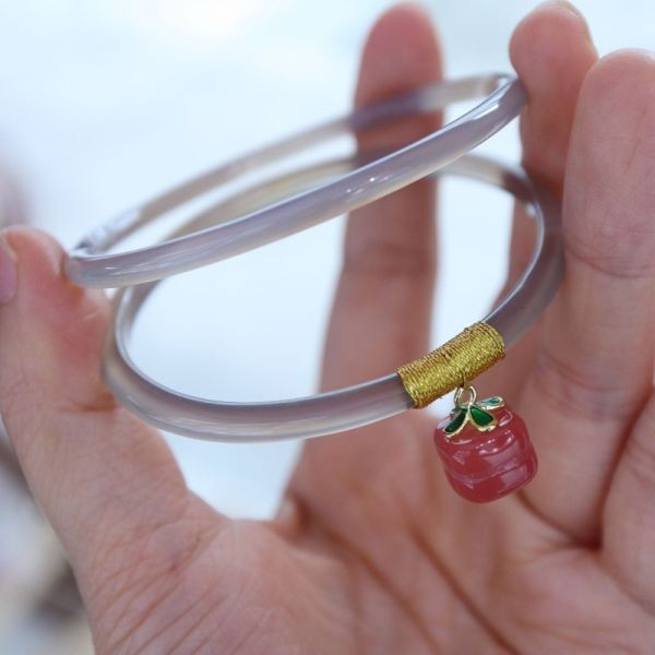 - [EasternStar] 天然 玉髄 瑪瑙 バングル 極細 レディーズ 腕輪 14K 金メッキ 灰色茶 柿如意 ペア