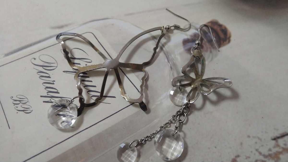 - □シルバーカラー蝶々×多面カットクリビーズ・揺れるピアス□アシンメトリー□