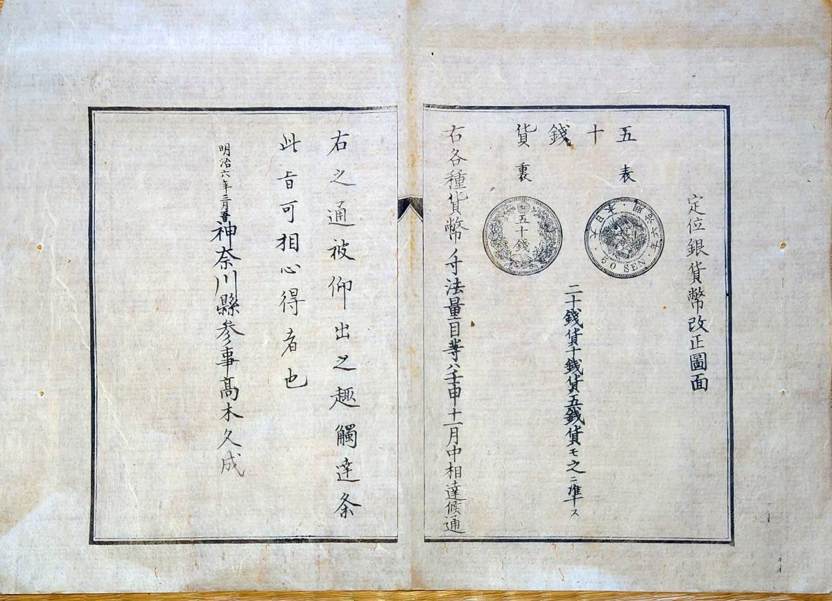 - f23021162〇明治布告布達 定位銀貨幣改正図面 50銭 表裏 明治6年 神奈川県〇和本古書古文書