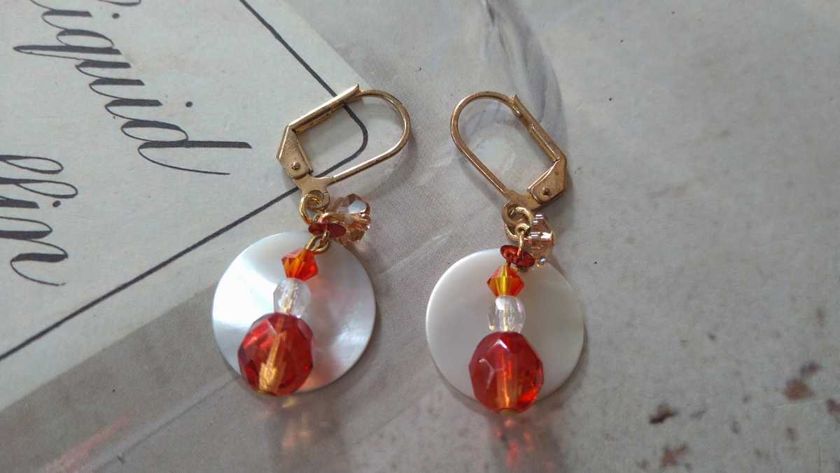- □白シェルサークル×多面オレンジ&クリアビーズ・揺れるピアス□