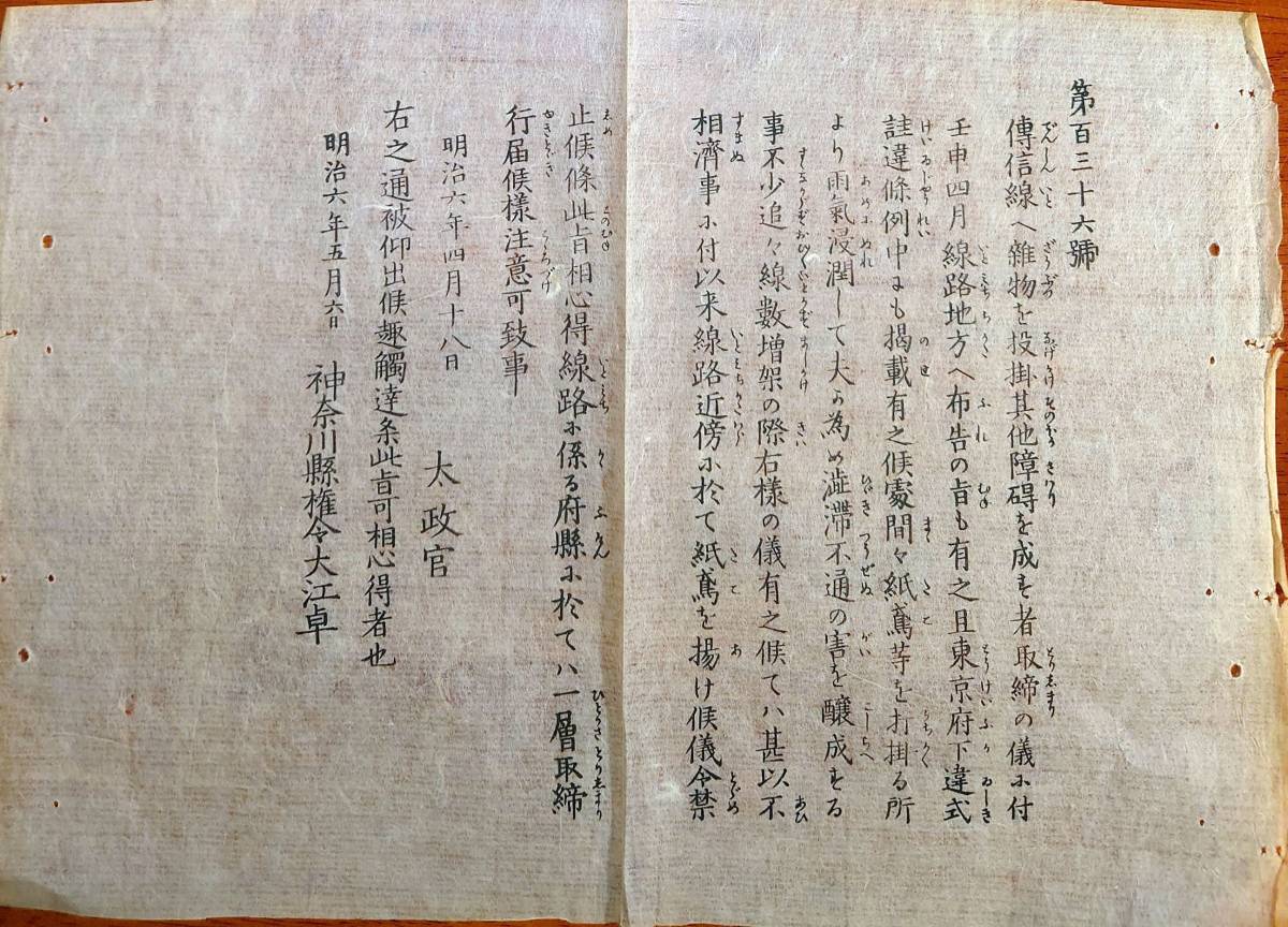 - f23022209〇明治布告布達 明治6年 神奈川県 電信線へ雑物を投掛其他障碍を成す者取締の儀 凧揚げ禁止〇和本古書古文書