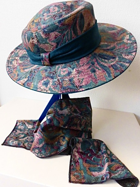 - ◆モードお帽子/ ドイツ製/シーベルガー/スカーフ付お帽子/深緑紫ボタニカルプリント/ サイズ M