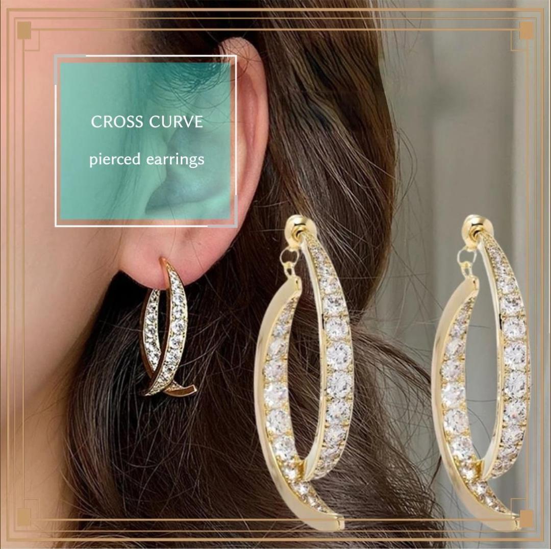 > *クロスカーブピアス 韓国 ピアス k18色ゴールド 可愛い czダイヤモンド*高みえ 可愛い キラキラピアス 個性的 韓国 アクセサリー