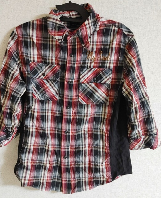- Lサイズ LAD 七分袖 シャツ スナップ 襟にワイヤー チェック柄 黒×赤