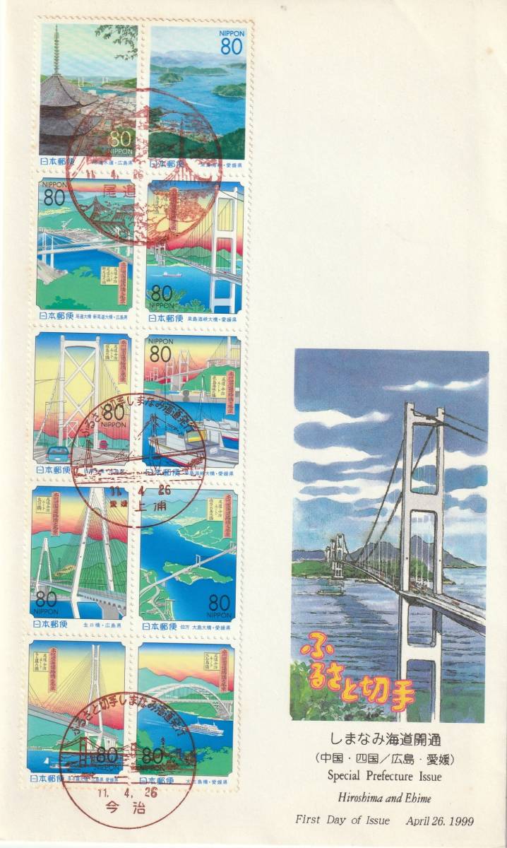 - FDC 1999年 ふるさと切手 しまなみ海道開通 80円10貼 JPA