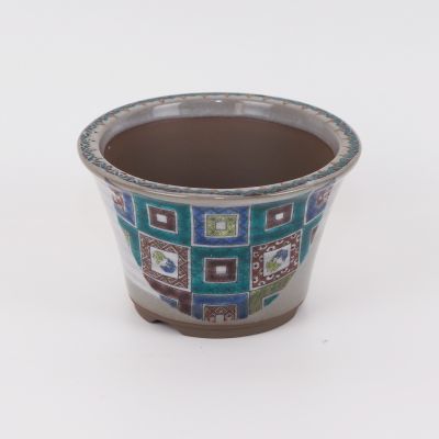 - 盆栽鉢 九谷焼 石畳 4号 幅12.5cm×高さ7.8cm 陶器鉢 陶器 ミニ盆栽 ミニミニ 幾何学模様 手書き 山野草鉢 植木鉢 絵付け 丸反型鉢 盆栽妙