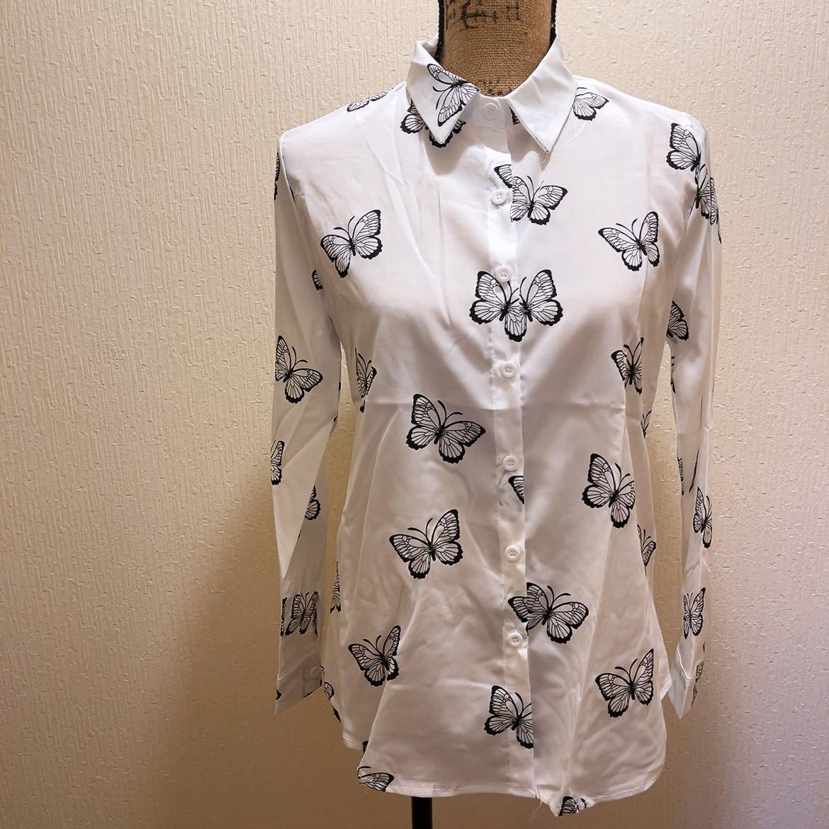 - 新品★ホワイト地★ブラックバタフライ柄★総柄★ブラウス★シャツ★M長袖 長袖シャツ