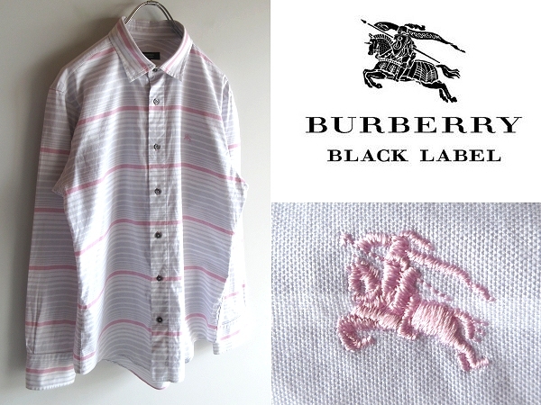 - 希少 BURBERRY BLACK LABEL バーバリーブラックレーベル ホースロゴ刺繍 コットン ボーダーシャツ 2 ピンク ライトラベンダー ネコポス可