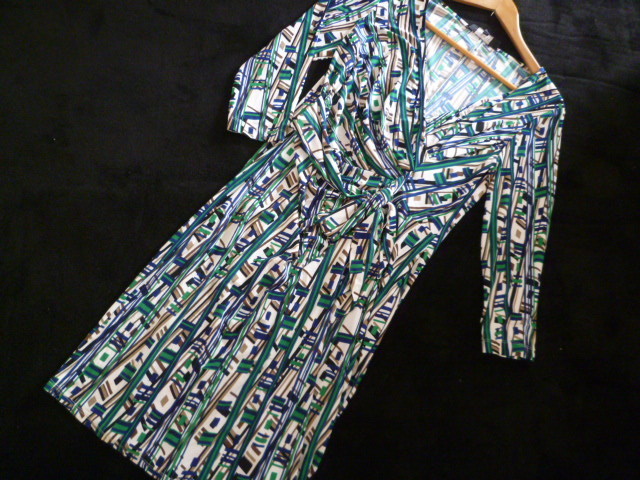 - NINE WEST DRESS◇グリーン系レトロ柄カシュクールリボンワンピース10/緑マダムミセスセクシーSEXY膝丈◇a324OP