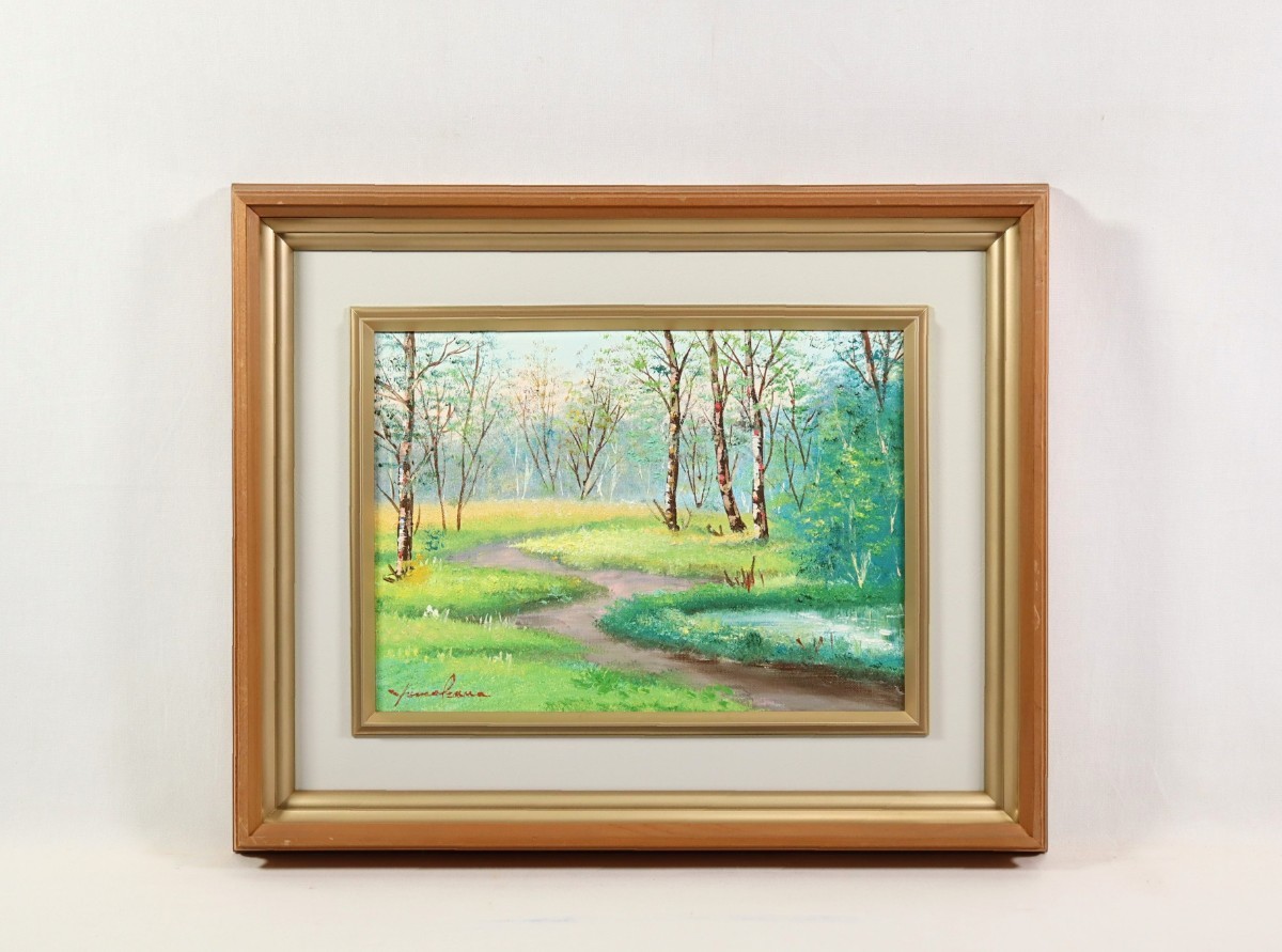 > 真作 山川孝 油彩「奥日光」画寸 33cm×24cm F4 岐阜県出身 應美会会員 色使い豊か、柔らかな筆致 白樺樹林が広がる緑豊かな高原の美 7384