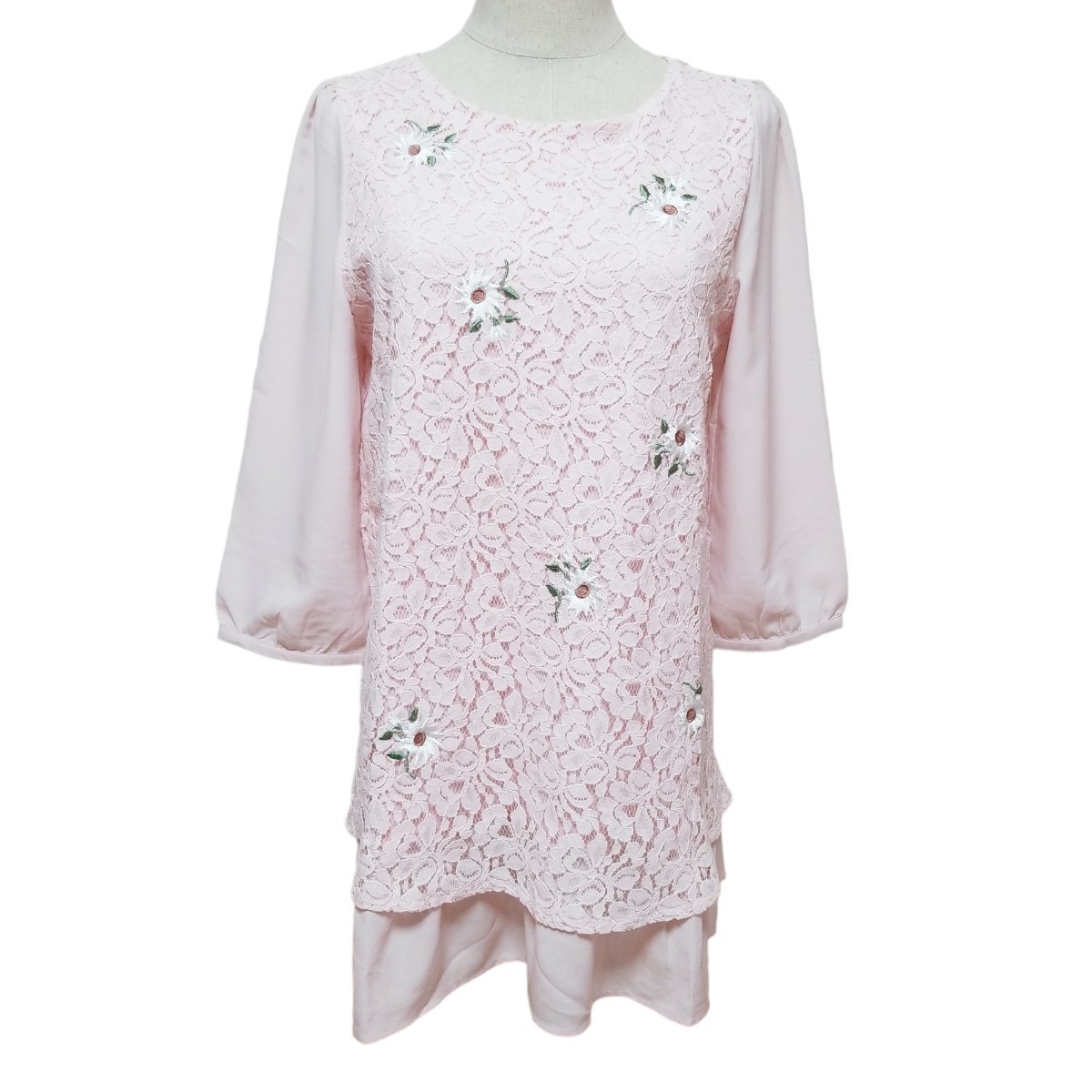 - Y253 レース シアー切替え レイヤード風 ミニワンピース チュニック 花刺繍 ボリューム袖 七分袖 レディース L相当 ピンク ガーリー 可愛い