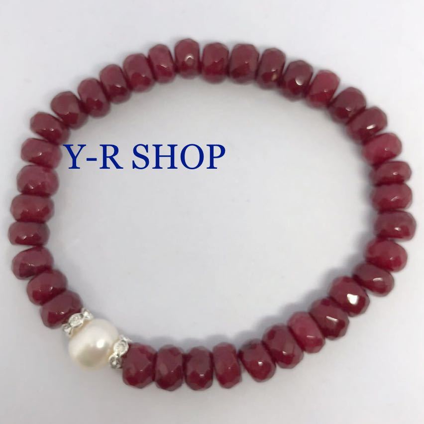 - 天然石★淡水パールのルビーの面取りビーズブレスレット★レディース腕輪数珠カラーストーンアクセサリーエスニックインドジュエリー新品