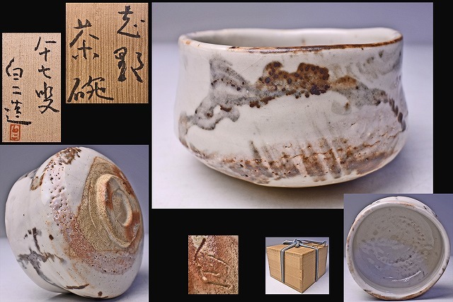 > 高橋白二 ★ 志野 茶碗 ★ 共箱 ★ 上作 ★薫陶:北大路魯山人 / 人間国宝 荒川豊蔵 ★ 艶のある釉景に絵付高台の緋色が良い景色 ★ 茶道具