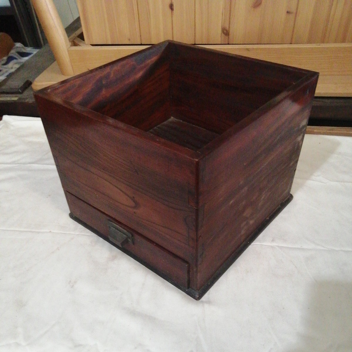 - 無垢木 家具 骨董 引き出し マイナスネジ 木目 角鉢 臍 昭和 (約31.5×高25.5cm) 木製 木箱 無垢材