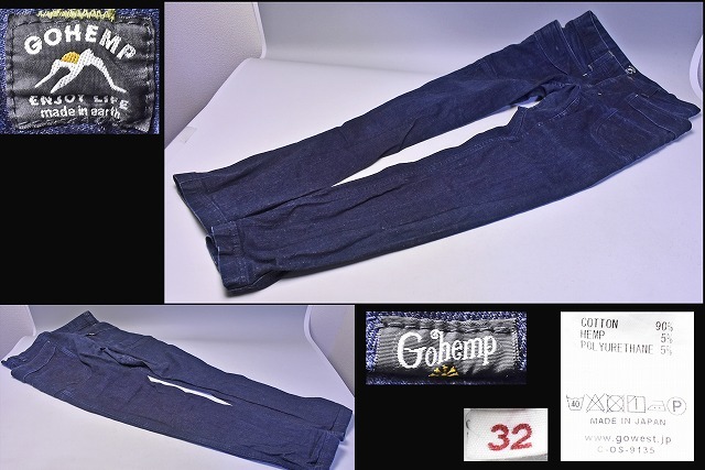 > ゴーヘンプ ★ GOHEMP ★ デニム ★ サイズ32 ★ 綿90% ヘンプ5% ポリウレタン5% ★ 日本製 ★ 両側に大きめポケット ★ 中古品 ★