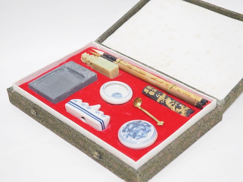> A1583 中国 書道具 一式 ケース付 ☆ 乾隆年製 筆 水滴 朱肉 肉池 硯 獅子彫刻 印材 印鑑 印章 篆刻 彫印 判子 墨 唐物 中国美術 良品 無傷