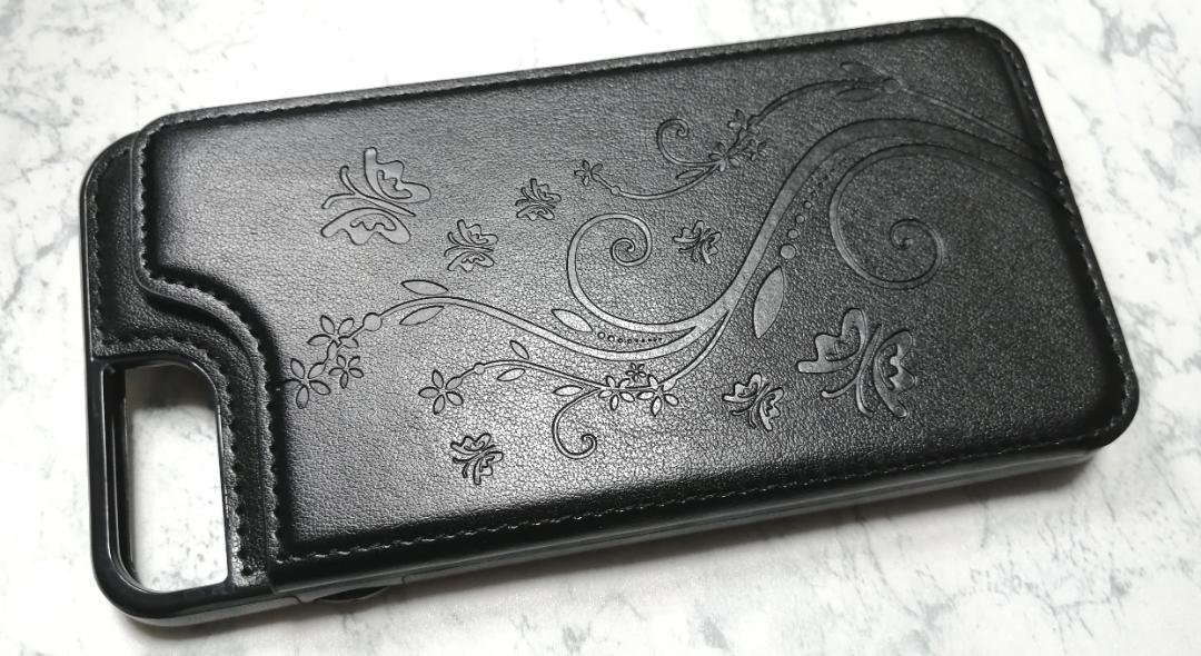 - 手帳型カード入れ付 iPhone7Plus/8Plus用 ケース 蝶 草花 黒色
