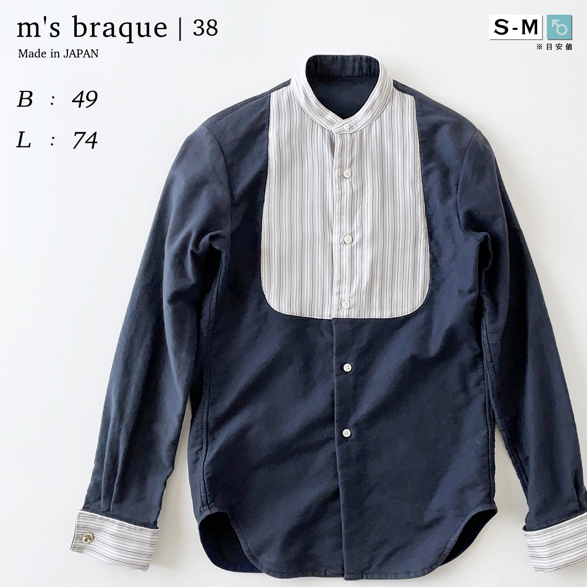 - m's braque 厚手 バンドカラー クレリック シャツ 紺 ネイビー ピンタック 切り替え バイカラー ツートン ダブルカフス エムズブラック 38