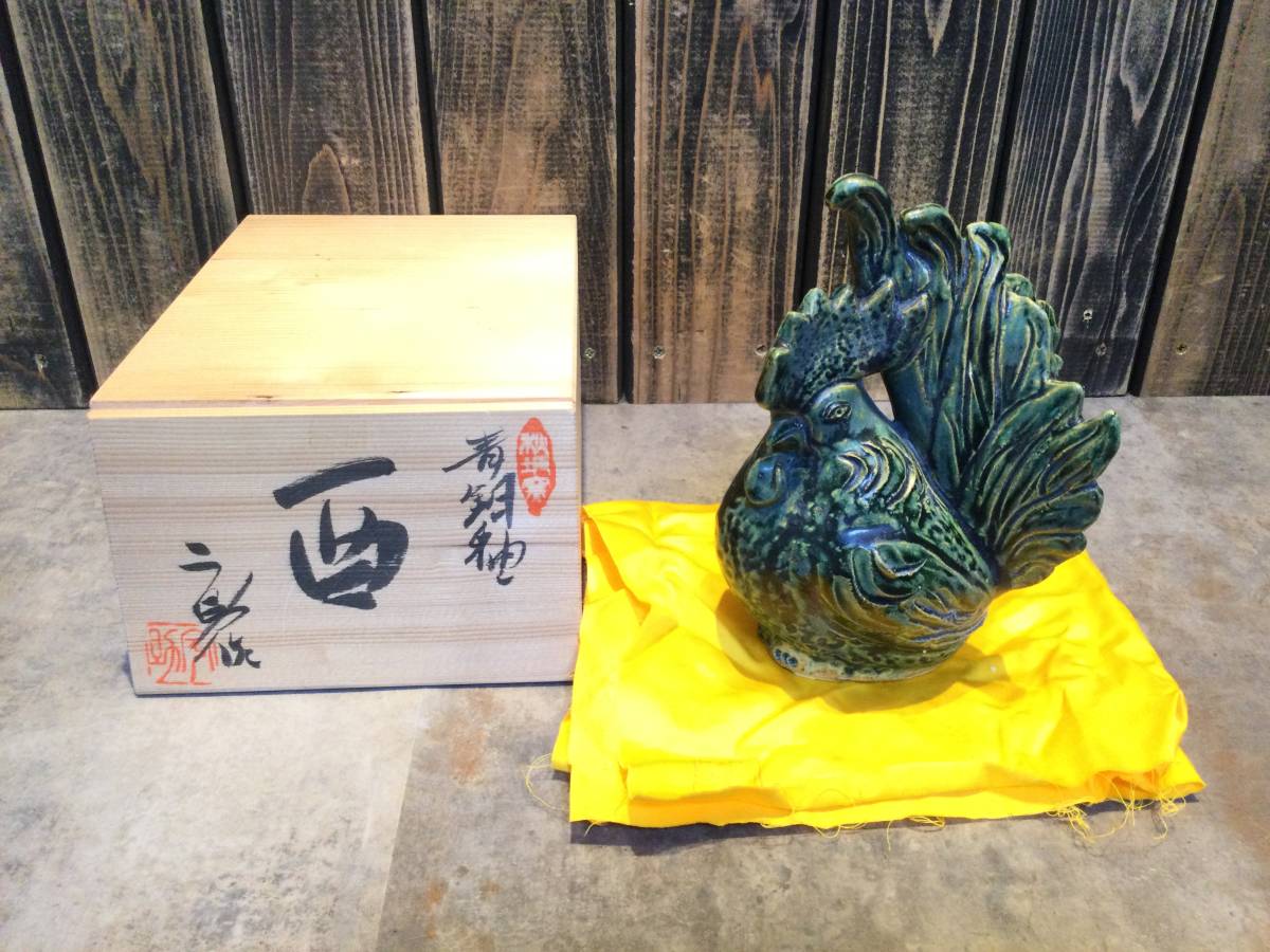 > 美品 青銅釉 秋坂窯 八代 加藤宇助 干支 酉 共箱・共布 とり 美術品 伝統工芸品 魔除け 置物 縁起物 オブジェ ディスプレイ 干支 開運