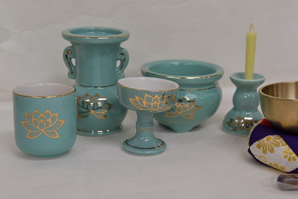 - ◇仏具セット◇青磁色金ハス陶器仏具 まず必要な物を小型上置き仏壇