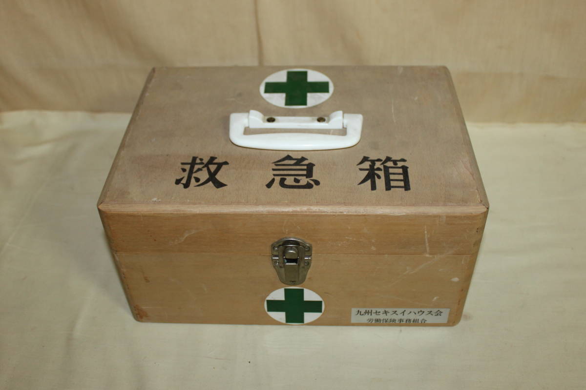 - 経年の雰囲気が素敵な木製救急箱薬箱 木箱ケース小物入古道具インテリアディスプレイ什器アンティークビンテージ収納レトロ金庫裁縫箱雑貨a