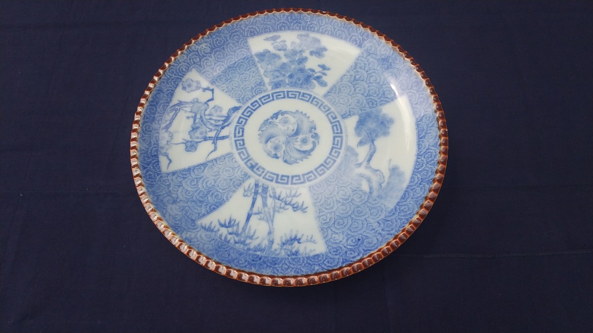 - 明治期 山徳窯 印判手 いげ皿31cm 松竹梅と菊の窓絵 山徳印