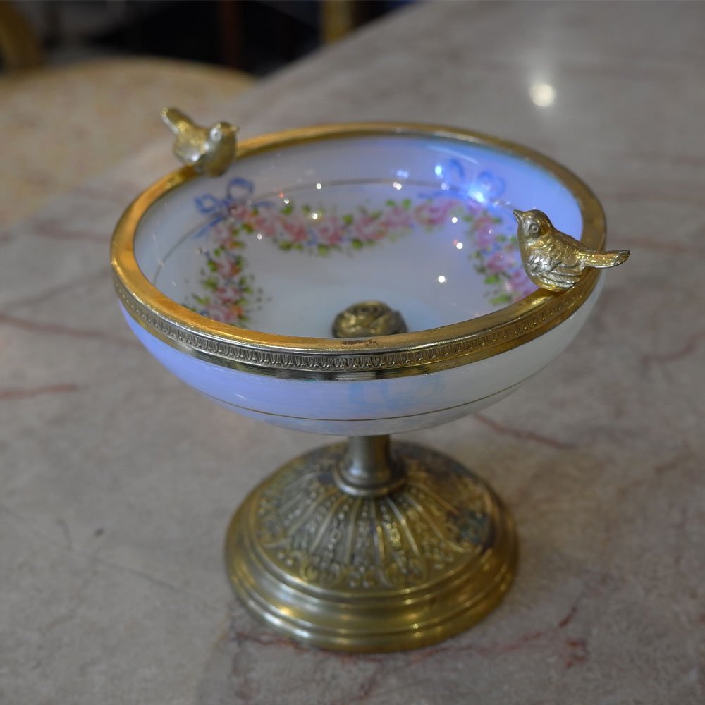 - 【”メルヘンな世界”漂うコンポート】ナポレオン三世フランス手書きリボン薔薇アクセサリージュエリートレイオパリンガラス小鳥花置物