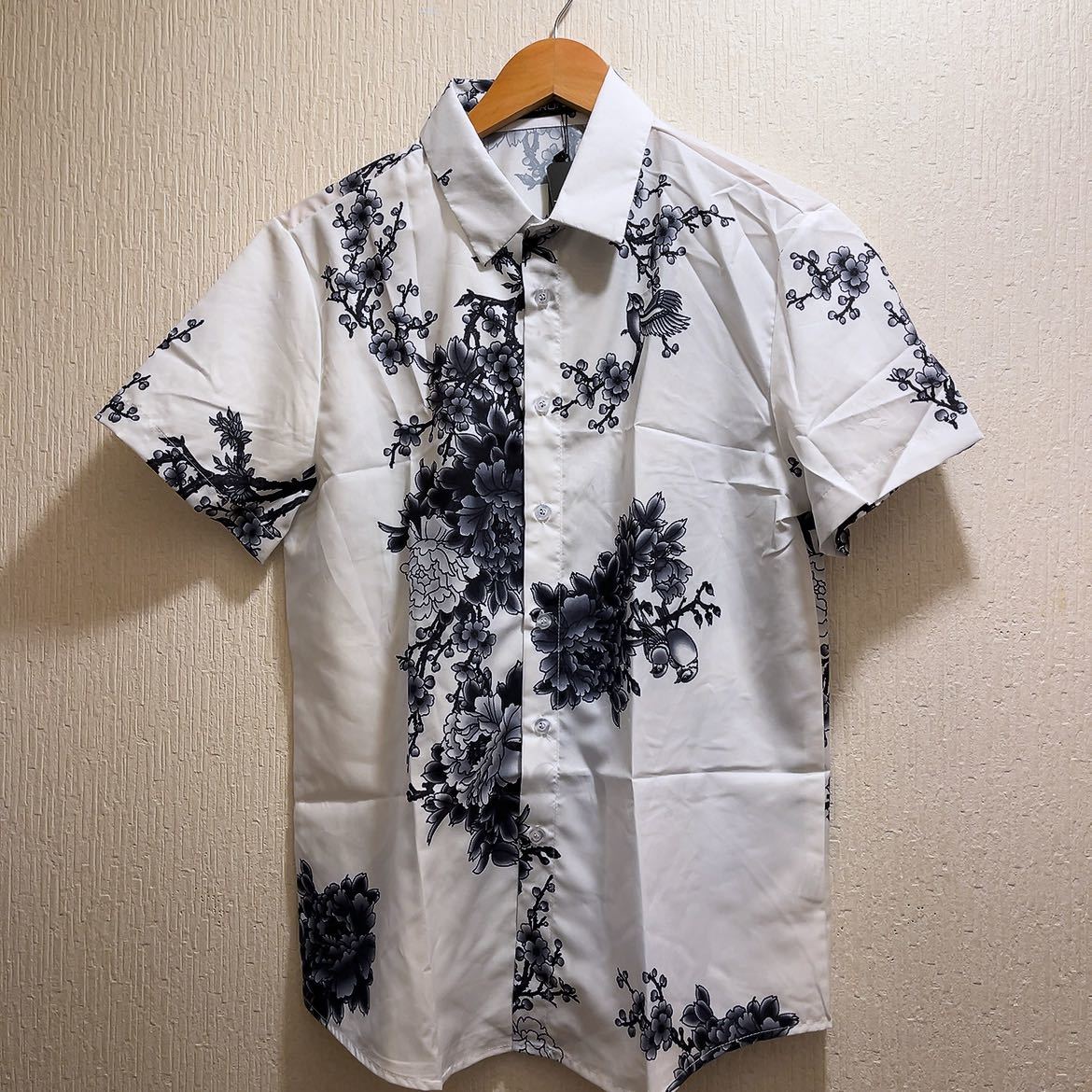 - 新品★ホワイト★グレー★花木&小鳥柄アロハシャツ★和風★ブラウス★ユニセックスLアロハシャツ ハワイアンシャツ