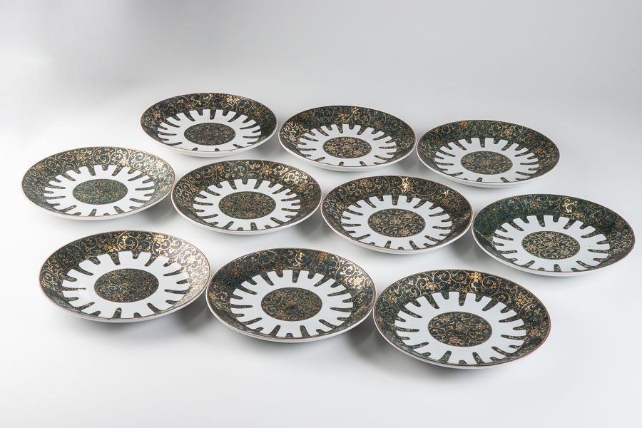 > 【九谷焼】『 九谷 青粒金彩花唐草文八寸皿 大皿 10客 16249 』 金襴手 和食器 料亭 日本料理 焼物皿 陶芸 陶磁器 古陶磁 骨董 青粒手