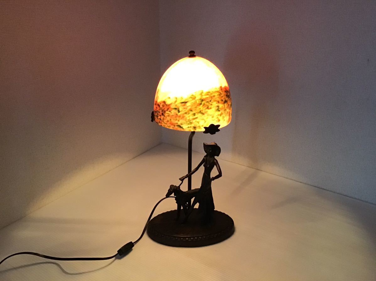 > ★アンティーク★ マツヤマ工芸 犬を連れた貴婦人 ガラス 照明器具 高約46cm 横約22cm インテリア テーブルランプ