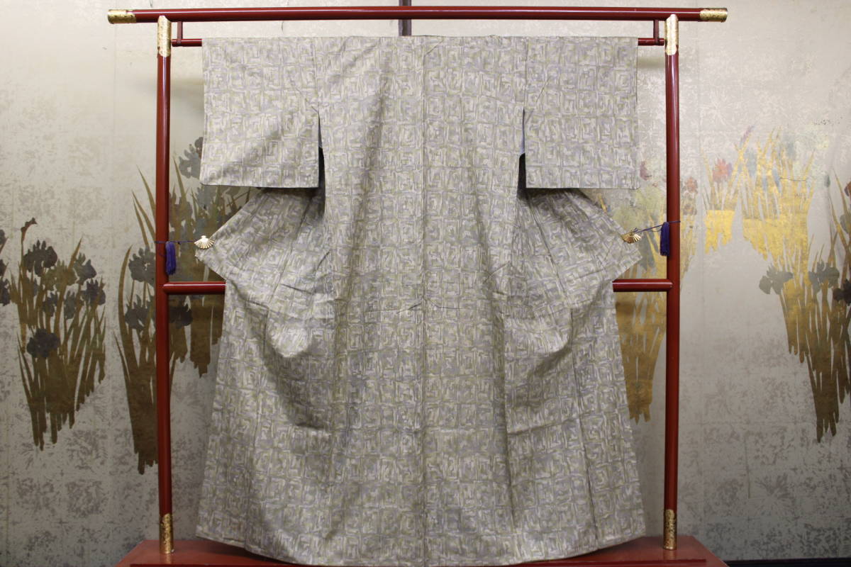 - きもの今昔5502 紬絣きもの 大島調絣広衿袷仕立て アイボリー地わさび色濃淡 ブロック積絵画風柄 身丈152cm