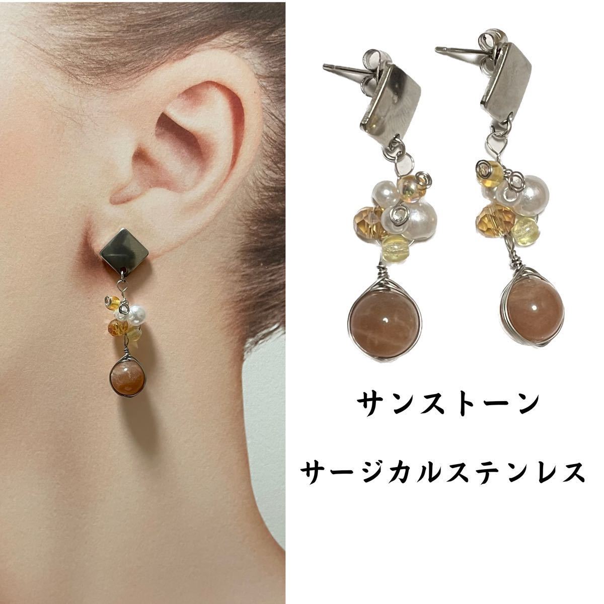 > イ45. 天然石 ピアス サンストーン オリジナルデザイン ハンドメイド サージカルステンレス アレルギーフリー ニッケルフリー
