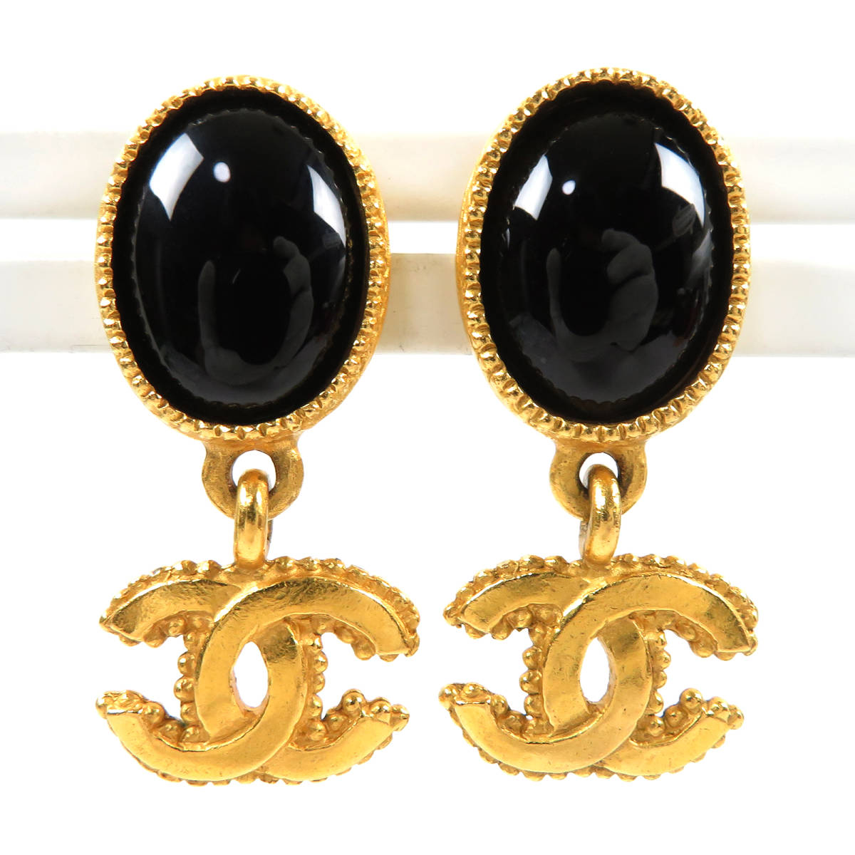 > CHANEL シャネル 96A ココマーク カボション カラーストーン イヤリング ゴールドカラー スイング ブラック ヴィンテージ レディース