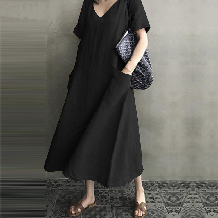 - 夏季 上質 綿麻混 ロングワンピース レディース リネンワンピース Vネック 大ポケット 半袖 大きいサイズ / ブラック