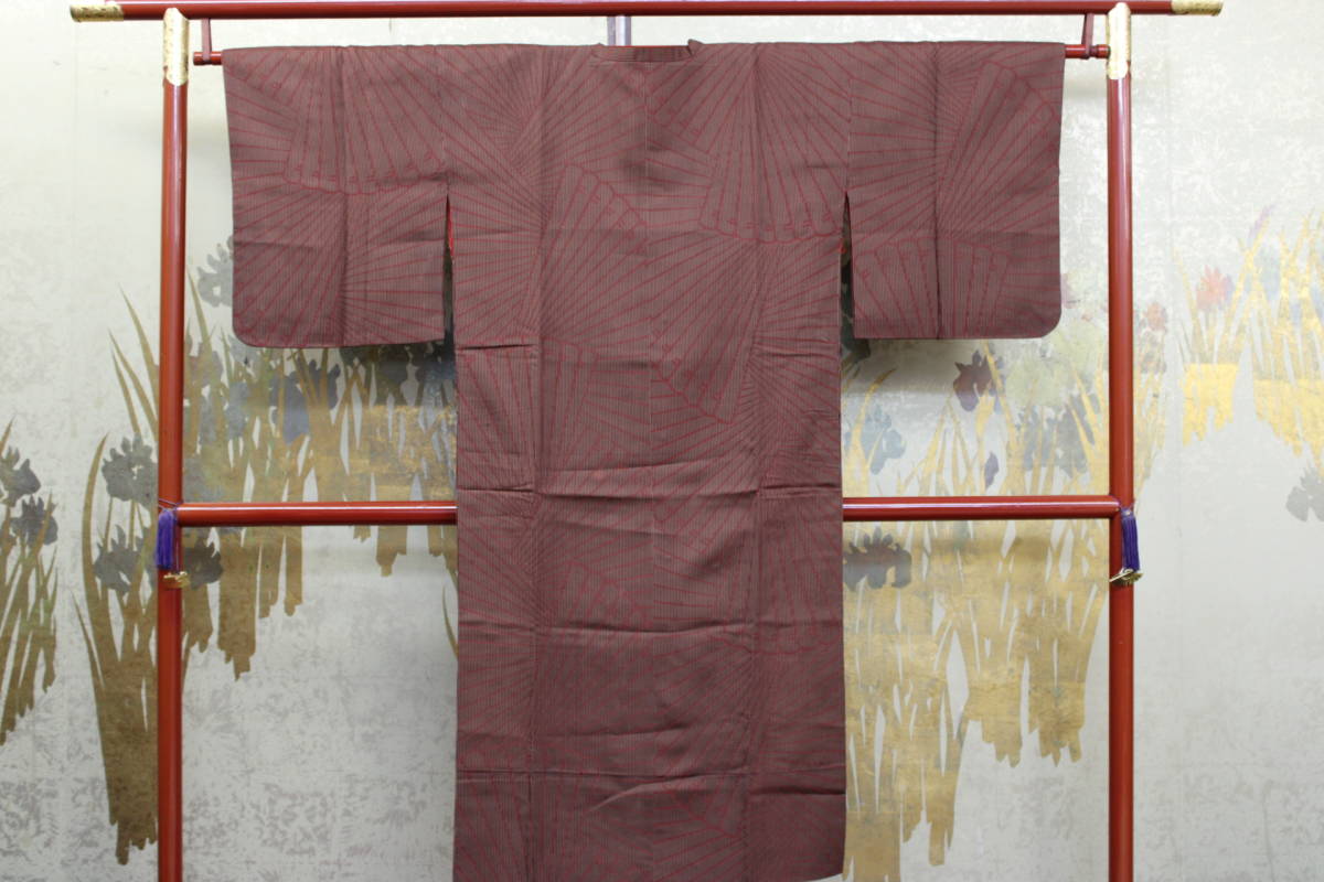 - きもの今昔5629 雨コート 焦げ茶色地に 扇羽根柄えんじ色 コート丈 127cm