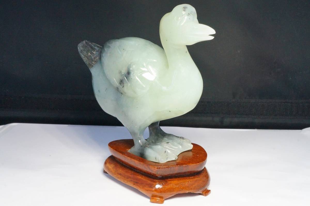 - 希少!上質品模様も綺麗な透明度のあるネフライト彫刻「鳥」木製台座付き1点のみ