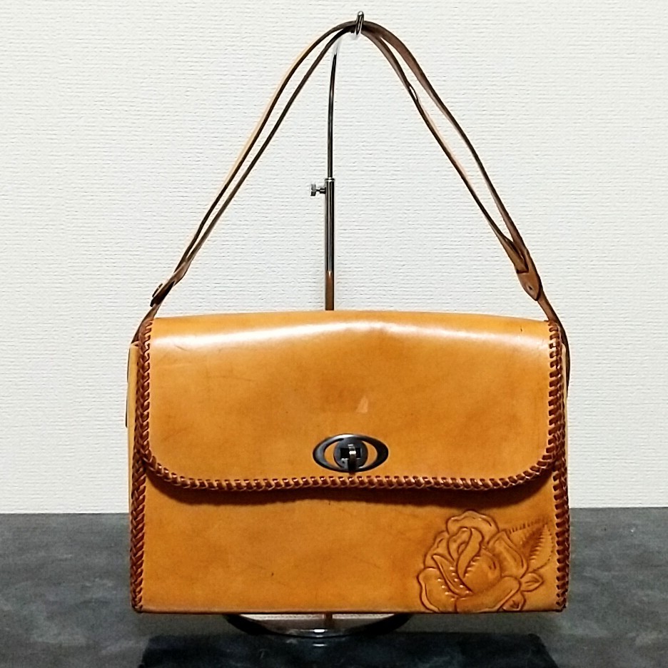 > ハンドバッグ レザー ショルダー クラフト ヒッピー 編み込み カービング 花柄 ヌメ革 70s オールド ヴィンテージ ビンテージ ブラウン