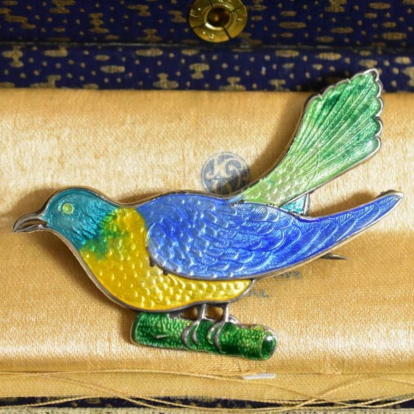 - アンティーク 純銀製/Silver/シルバー 手描き エナメル/七宝の青い小鳥/バードのブローチ 大きめ 本物保証