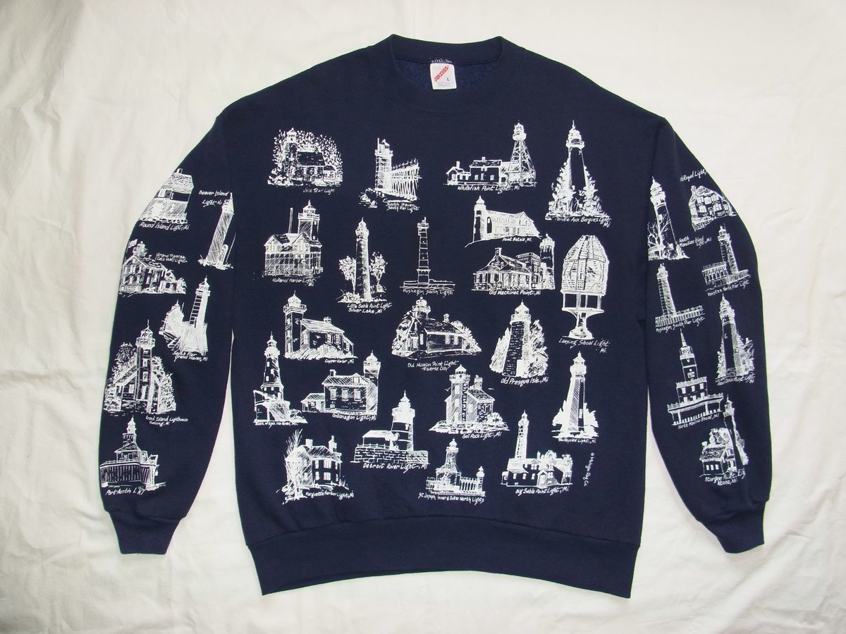 - ☆ 80s90s USA製 ビンテージ Michigan Rag Co. ミシガンラグ ライトハウス 灯台 総柄 スウェット sizeL 紺 ☆古着 JERZEES トレーナー ART