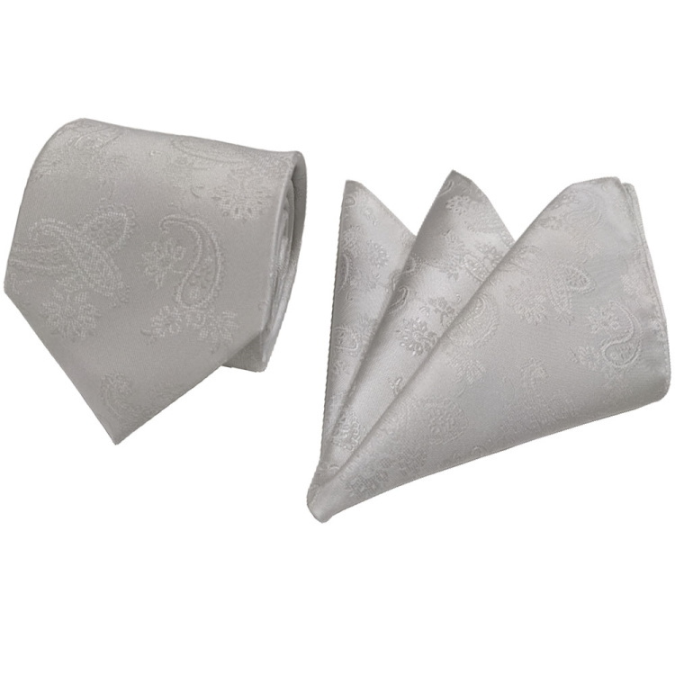 - ネクタイ ポケットチーフ付 シルバー ペイズリー シルク100% 日本製 結婚式 フォーマルネクタイ メール便送料無料 PT-P507