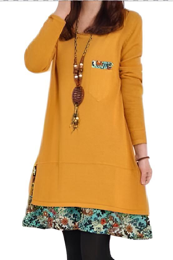 - 7-13-1.チュニックワンピ 膝丈 ゆったり カジュアル 花柄 イエロー M