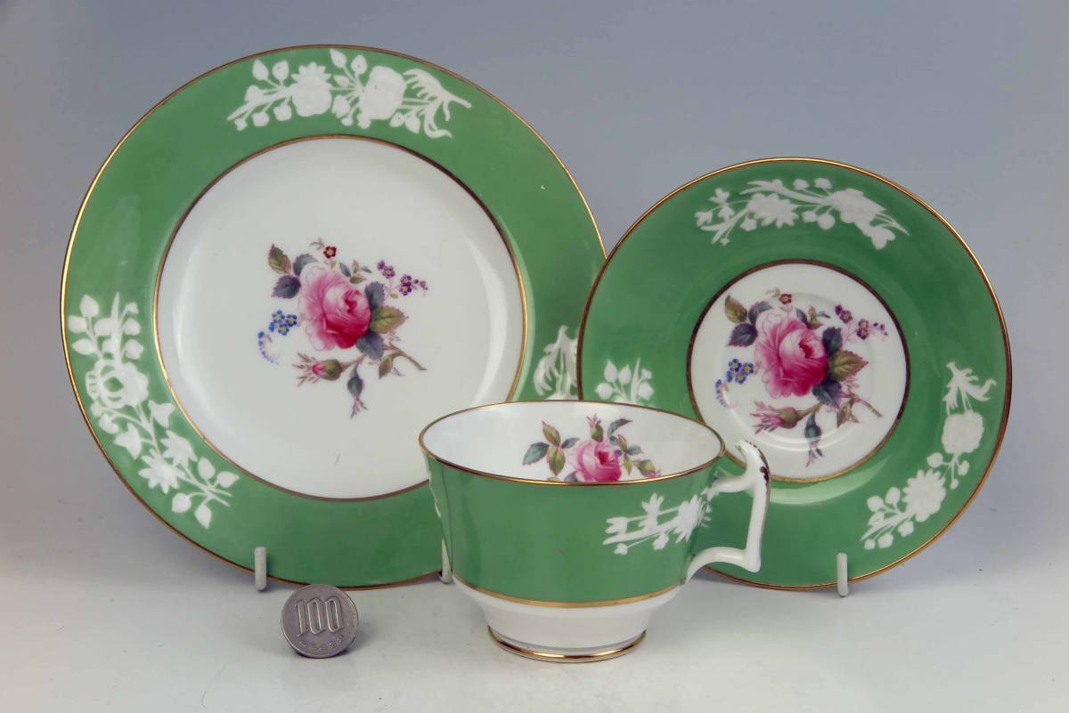 > スポード = 金彩花絵付け・カップ&ソーサー&プレート 18cm =R7062= Lt.Green. + Pink ROSE (1級品) 貴重な一品です。