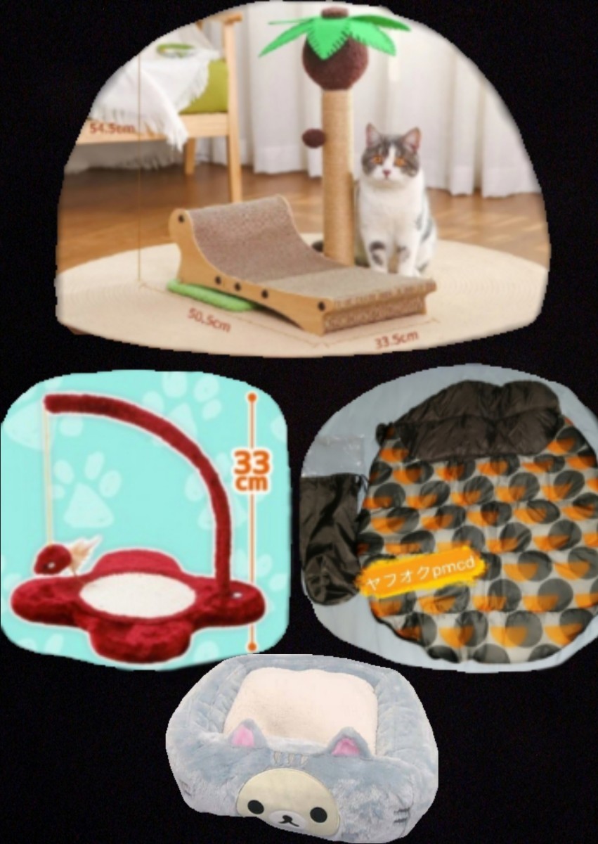 - 【ペット用品】猫ちゃんセット ヤシの木 リゾート風爪とぎ、ねずみ付きスクラッチャーマット、寝袋、コリラックマ クッション ベット