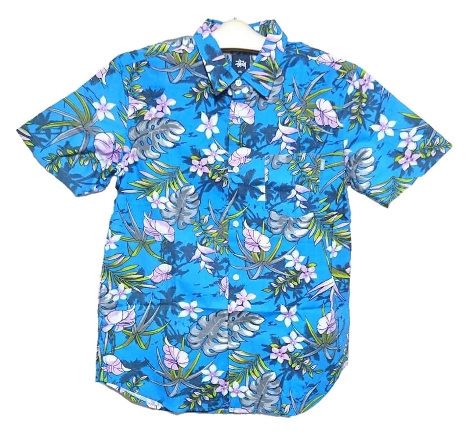 - 希少2014年発売!新品タグ付き!定価¥15400!STUSSY ステューシー/ボタニカル&ハイビスカス総柄 半袖アロハシャツ S ブルー