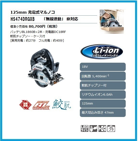 > マキタ 125mm 18V 充電式マルノコ HS474DRGXB (黒)【鮫肌チップソー付・無線連動非対応】 ■安心のマキタ純正/新品/未使用■